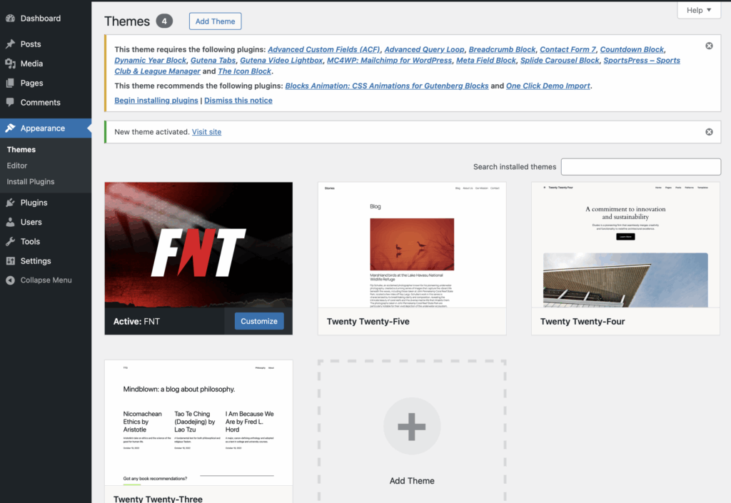 When you first install the theme you’ll see a popup on your dashboard from the theme asking you to install a number of plugins.